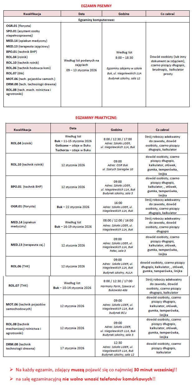 Poniżej znajduje się rozpiska przypominająca terminy sesji egzaminów zawodowych ZIMA 2026 w Buku.Przypominamy, że szczegółowe terminy dla każdej osoby zostały podane na zajęciach i/lub udostępnione na TEAMSie.